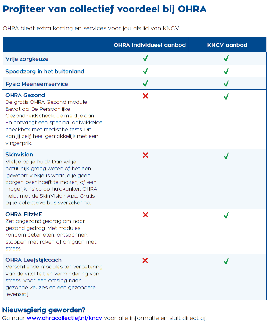 woensdag 27 november 2019 09:54 Als KNCV-lid kun je een zeer gunstige zorgverzekering afsluiten via OHRA. Met collectieve afspraken krijg je korting en ook nog eens handige extra’s, zoals bijvoorbeeld een app om huidplekjes snel te laten controleren of het meenemen van fysio-behandelingen naar het volgende jaar.